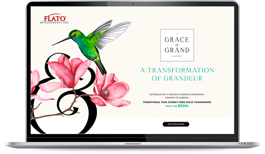 FLATO Developments had a grand vision for their upcoming master-planned community in Lindsay – a vision aimed at creating an expansive, innovative, and transformative new home community that would make thousands of new residents proud to call it their home. To bring this ambitious vision to fruition, they collaborated with COOLAID Studios to devise a unique name and a creative brand that would distinguish this new home community. This collaboration resulted in the birth of "Grace & Grand," a name that cleverly melds the charm of small-town Lindsay with the grandeur of this exceptional community. Impeccably executed brand creative was meticulously designed with the deliberate purpose of captivating potential homeowners. The launch of the initial phase of this project was nothing short of extraordinary, serving as a testament to the unwavering dedication and ingenuity of the teams involved.